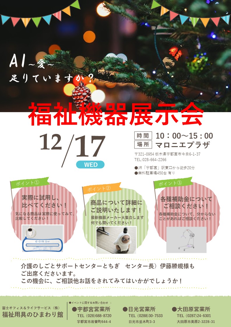 さて、弊社では12月17日に福祉機器展示会をマロニエプラザにて開催します。